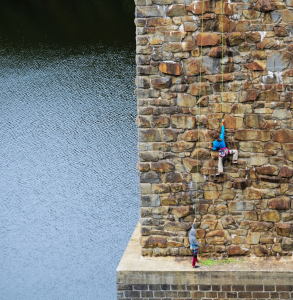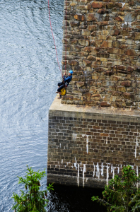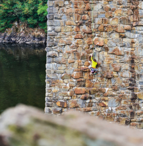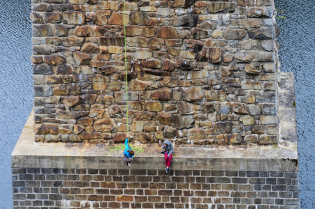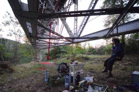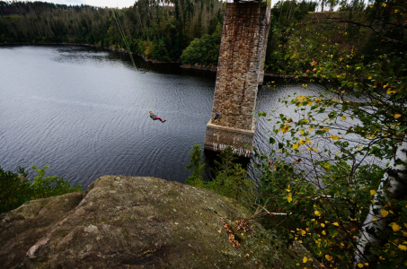 Most je ale naprosto ideální i pro realizaci všech možných houpaček. Asi největší se dá napnout mezi pilíři. Skáče se pak z vršku pilíře a lano je ukotvené na spodku konstrukce uprostřed. Na místě je velký řetěz od nějakých skokanů. My jsme si napnuli houpačku z mostní konstrukce na skály na břehu. Skalní bloky tady tvoří dokonalý, snadno dostupný exit. Druhé lano, které jsme skokanovi hodili, a kladkostroj nám ho pomohly snadno dostat zpátky na skálu. Začali jsme opatrně, ale nakonec došlo i na skoky pozadu, salta a různé krkolomné odrazy od skály. Další možností, jak si užít na mostě vertikální zábavu je slaňování a lezení po kamenných pilířích. Každý si může najít lehčí i těžší cesty. Jistit se dá shora za konstrukci.