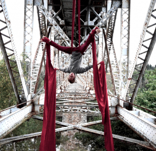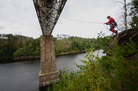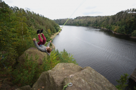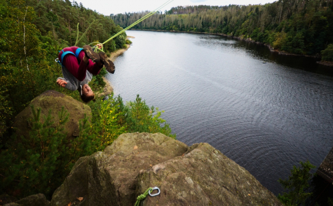 Ona po střechu naložená dodávka popravdě zas tak moc rychle nejde, ani když je pedál sešlápnutý až k podlaze. Takže nás ze severních Čech na jih k obci Červená nad Vltavou nežene ani tak rychlost auta, jako spíš nadšení a očekávání. Kromě lezení na Rovišti je naší hlavní zastávkou jedinečný kamenný most nad Orlickou přehradou. Máme lana, háky, závory. Ne, ty ne. Už jen highline a akrobatickou šálu.